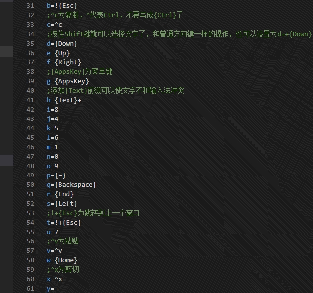 e={Up}则代表e键变成了方向键的上键Up={Volume_Up}则代表方向键上键变成了多媒体键盘,设置音量大小码字时候接到摩托车考试在29号,激动,等了一个月了,我也写不下去了,你们自己看配置文件里面提示自己来吧